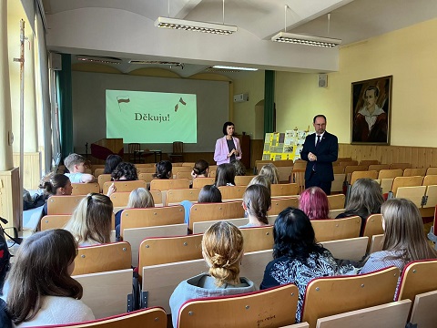 29 października 2025 Pan Ambasador Břetislav Dančák odwiedził naszą szkołę. Wizyta rozpoczęła się od spotkania z Panią Dyrektor Izabelą Koziej, a następnie Pan Ambasador obejrzał program przygotowany przez uczniów klas z językiem czeskim: 4i oraz 4f. Były to scenki zwieńczające projekt "Zdradliwi przyjaciele tłumacza". Wizyta zakończyła się spotkaniem Pana Ambasadora z młodzieżą i dyskusją. Mogliśmy dowiedzieć się, między innymi, na czym polega praca dyplomaty, co można zrobić, aby zostać ambasadorem, za co Polacy kochają Czechów i za co Czesi kochają Polaków.