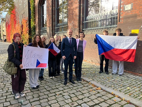 29 października 2025 Pan Ambasador Břetislav Dančák odwiedził naszą szkołę. Wizyta rozpoczęła się od spotkania z Panią Dyrektor Izabelą Koziej, a następnie Pan Ambasador obejrzał program przygotowany przez uczniów klas z językiem czeskim: 4i oraz 4f. Były to scenki zwieńczające projekt "Zdradliwi przyjaciele tłumacza". Wizyta zakończyła się spotkaniem Pana Ambasadora z młodzieżą i dyskusją. Mogliśmy dowiedzieć się, między innymi, na czym polega praca dyplomaty, co można zrobić, aby zostać ambasadorem, za co Polacy kochają Czechów i za co Czesi kochają Polaków.